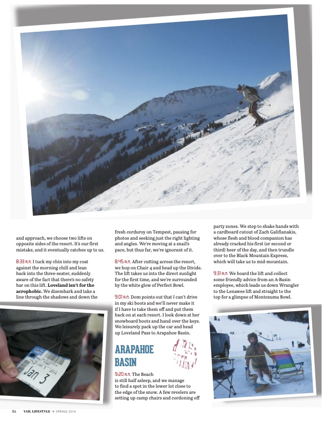 9:01 a.m. Dom points out that I can’t drive in my ski boots and we’ll never make it if I have to take them off and put them back on at each resort. I look down at her snowboard boots and hand over the keys. We leisurely pack up the car and head up Loveland Pass to Arapahoe Basin.
