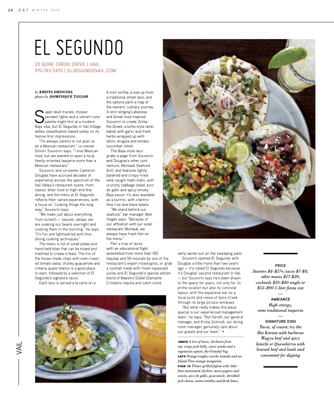 Souvorin and co-owner Cameron Douglas have accrued decades of experience across the spectrum of the Vail Valley’s restaurant scene, from classic diner food to high-end fine dining, and the menu at El Segundo reflects their varied experiences, with a focus on “cooking things the long way,” Souvorin says.