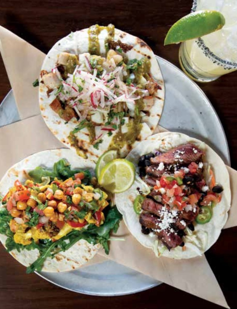 Each taco is served a la carte on a 6-inch tortilla, a size up from a traditional street taco, and the options paint a map of the owners’ culinary journey. A stint slinging Lebanese and Greek food inspired Souvorin to create Zorba the Greek, a kofta-style lamb kabob with garlic and fresh herbs wrapped up with tahini, arugula and tomato- cucumber relish.