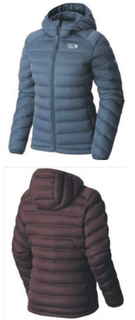 The jacket has two hip pockets and an internal stash pocket and comes in hood- ed and non-hooded versions and an array of colors, including black, maroon and navy. Mountain Hardware also makes a men’s StretchDown Jacket with all of the same features.
