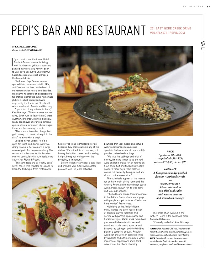 If you don’t know the iconic Hotel Gasthof Gramshammer building, with its cheerful yellow stucco and painted millwork, you haven’t been to Vail, says Executive Chef Helmut Kaschitz, executive chef at Pepi’s Restaurant & Bar.