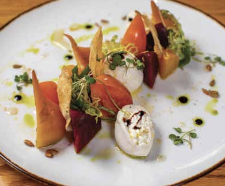 Burrata, beets and tomatoes: oven- roasted beets, basil oil, smoked sea salt, tomatoes, sunflower seeds and burrata cheese.